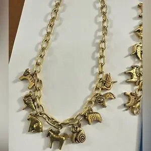 Elegant gold charm necklace featuring unique animal and object charms. Perfect for adding a touch of whimsy to any outfit. Very chunky and vintage look. The bracelet is around 7” long and the chain is roughly 20”. All from vintage jewelry being passed down. Perfect condition! Looks like it’s never even been worn!