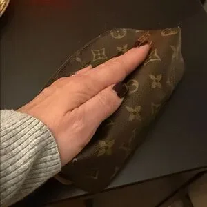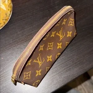 Chic Louis Vuitton clutch with signature monogram pattern. Rich brown and gold tones.