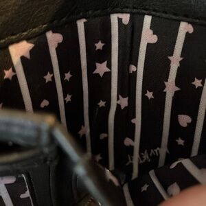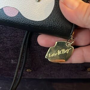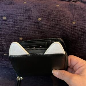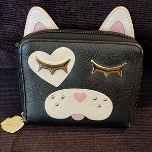 This whimsical Betsey Johnson wallet teatures a playful cat face design with black and pink accents.