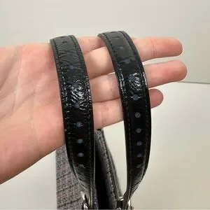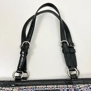 Tweed and black patent leather shoulder tote bag from 2011.