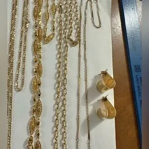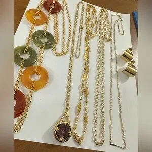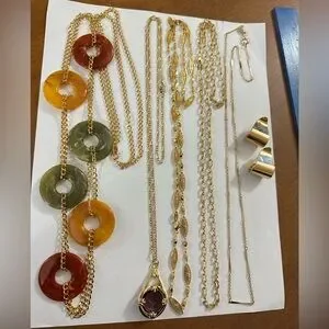 5 Avon Necklaces and 1 pair of Avon stud earrings. Vintage Avon Gold necklace with vibrant red, green, and orange circular accents. Avon gold tone Figaro chain with purple charm. 3 gold Avon necklaces. 1 pair of swirl gold tone Avon earrings. Elegant design for any occasion. All jewelry being passed down which is why I’m trying to get rid of it in bundles.