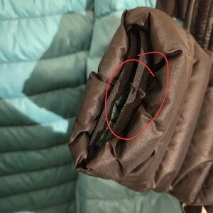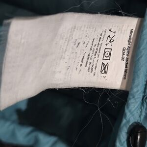 Women's Size Small. Rab Microlight Alpine Hooded Jacket with Nikwax Hydrophobic Down. Black exterior with blue interior. Comes with original stuff sack. Small snag on left cuff, small rip on right cuff, and pinhole on inside left baffle under the arm hole, all of which are depicted in photos. Overall good used condition. Clean, with lots of life left.