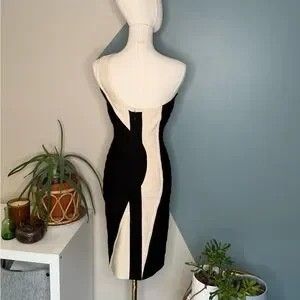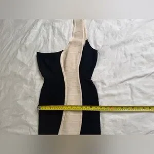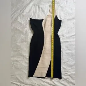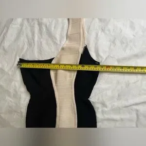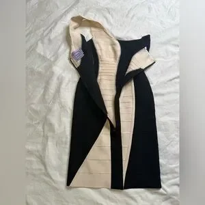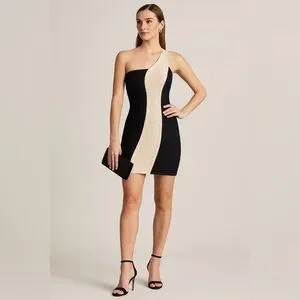 Herve Leger “Nita” One-Shoulder Colorblock Bandage Dress Black Beige Small