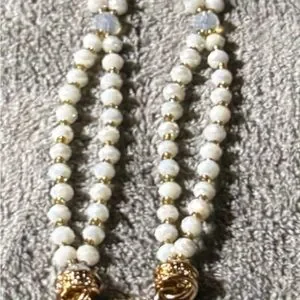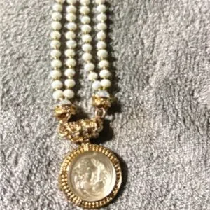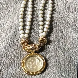 Elegant necklace with white beads and gold accents. Features a detailed gold pendant.