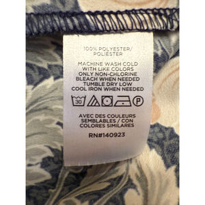 This is a new with tags LOFT Petite long-sleeve dress in size 10P, featuring a navy background with an intricate beige and grey floral pattern. The dress has a round neckline and elasticized cuffs on the sleeves. It is made of 100% polyester and includes a discreet back zipper closure. Care instructions indicate machine wash cold.