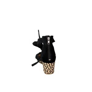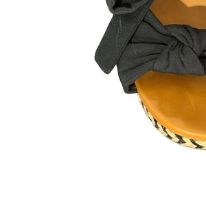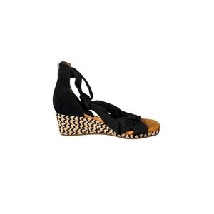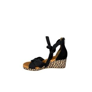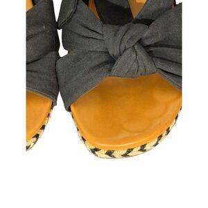 Black wedge espadrille sandals with a knotted bow accent on the toe and adjustable ankle ties. A back zipper closure ensures easy wear. The wedge heel features a classic espadrille rope wrap design. Perfect for a summer day out, a beach vacation, or a casual evening stroll. Excellent, lightly used. These are a classic twist!