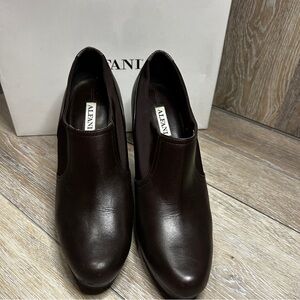 Step into sleek sophistication with these Alfani dark brown platform heels, size 7.5. Featuring a closed-toe design, tapered 4” heel, and elastic side panels for easy slip-on wear, these shoes blend comfort with elevated style. The rich leather and fabric combo adds texture and polish, perfect for office outfits, fall layering, or a night out.