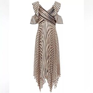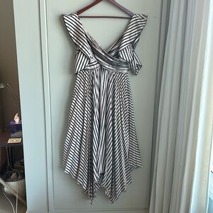 Elegant midi dress with striking black and white stripes. Features unique shoulder cutouts and a flowing hemline. Perfect for any occasion.