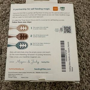 Set of three toddler utensils in neutral colors. Includes tan, brown, and blue spoons. BPA-free and safe for ages 6+ months.