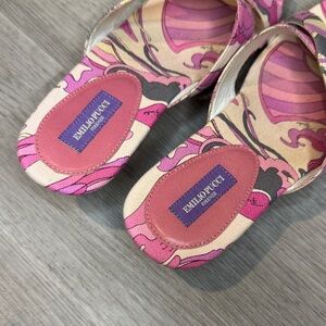 Bold Emilio Pucci sandals with pink and cream patterns. Perfect for a stylish look.