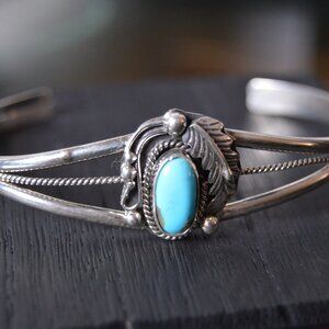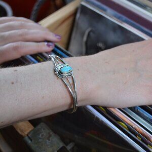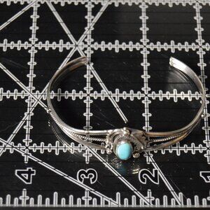 This is an elegant, handmade sterling silver and turquoise cuff bracelet by Navajo artist Grace Kenneth. Women's size 7"