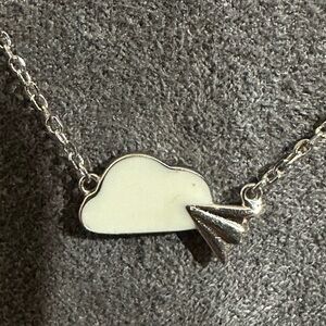 Dainty cloud and paper airplane pendant made of silver 925 on a silver 925 dainty box chain. The necklace length is about 15” with a 1.5” extender chain. It has a jump ring closure. The pendant is a little under 1/2” wide and 1/4” long. It’s very cute and unique.