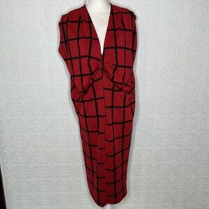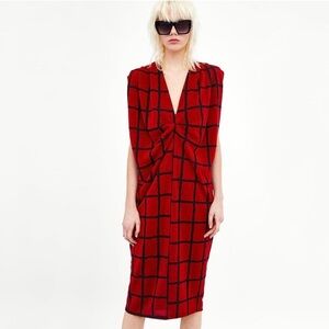 Zara Grunge Knit Black & Red Checkered MIDI Dress with a Metallic Yarn throughout. V-Neckline that Gathers in the Front. Shoulders have Pleats & Shoulder Pads