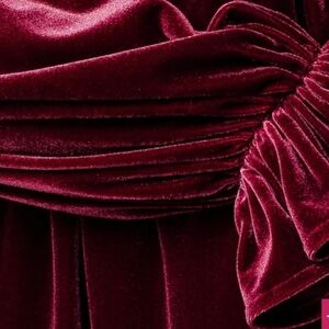 Chic burgundy velvet dress with long sleeves and a V-neckline. Features stylish ruffled cuffs and hem.