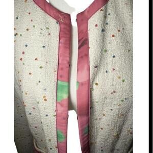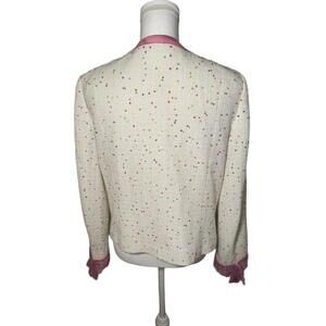 Features: Collarless design, Two patch pockets with pink trim, Pink trim along collar, front opening, pocket edges, and cuffs, Textured weave fabric with colorful flecks
