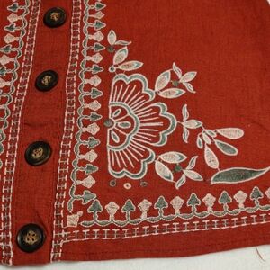 This stylish red skirt features intricate embroidery and a classic button-up design. Perfect for adding a pop of color to your wardrobe.