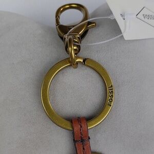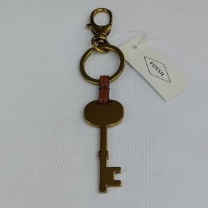 Solid Brass key-shaped keychain by Fossil. Includes a tan leather detail and brass hardware.l