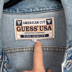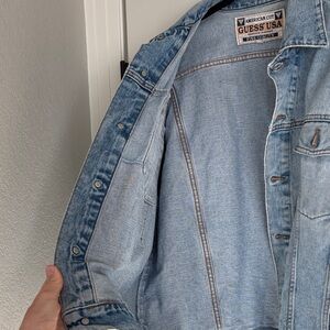 Vintage Classic Guess denim jacket in light blue. Features button-up front and dual chest pockets. Does have small orange spots on back of right elbow. Very soft denim have enjoyed this piece.