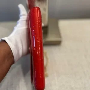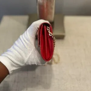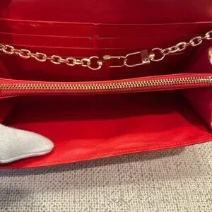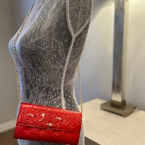 Authentic Louis Vuitton Sarah wallet (2009 style year) is crafted of monogram embossed varnished leather in a gorgeous and hard to find color. It is a red with an orange tint that is slightly metallic when looking at it. This is not a normal red color!!! The wallet has a gold snap slightly tarnished that opens the front flap to a partitioned interior of matte leather with 10 card slots, a zippered coin compartment, slip pocket, and a bill pocket. Wallet is in very good condition with minor exterior wear. Inside is in good condition with the exception of the wear under the flap but absolutely no leather peeling. Coin pocket has normal, light coin residue. See all pictures for visual details. This wallet is in very good condition.