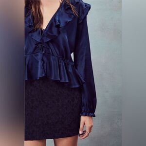 For Love and Lemons 🍋 Blue Satin Better Open Back Ruffle Blouse Size S