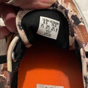 Vans sneakers with a vibrant animal print. Features a black tongue and bright orange interior.