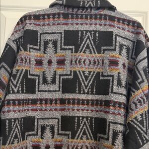 Elevate your style with this jacket featuring a striking geometric pattern. The black and gray design adds a modern touch, perfect for versatile layering.