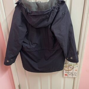 Cozy fleece jacket with a soft interior. Features a practical hood and durable design.