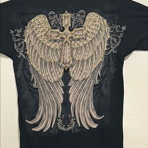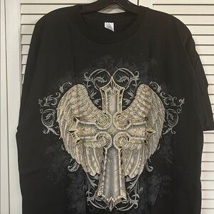 These short sleeve tees feature intricate cream designs on a black fabric, creating a striking visual contrast. The elaborate patterns, inspired by tribal and heraldic motifs, cover a significant portion of the front, adding a touch of elegance to your casual wardrobe.