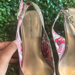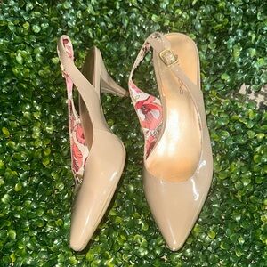 Chic Bandolino slingback heels with a shiny finish. Features a floral inner lining. Ideal for stylish outings.