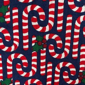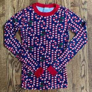 Navy blue with candy cane print Hanna Andersson 2 piece pajama set, size 14. Excellent condition, two small snags/holes on upper right leg, otherwise no flaws. Ships quickly from smoke free/pet friendly home.