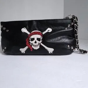 Fashion Express Black Studded Rhinestone Skull & XBones Pirate Wristlet with Leather Wrapped Silver Link Chain