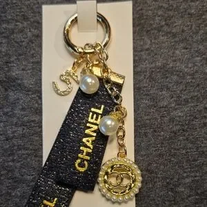 Stylish key holder, made for CHANEL GWP, not by CHANEL. Key holder is black with gold lettering. Features a pearl accent and gold chain detail. Perfect for adding elegance to your accessories.