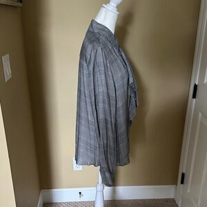 Chic gray plaid blouse. Features elegant bow detail. Long sleeves. Perfect for office or casual wear.