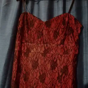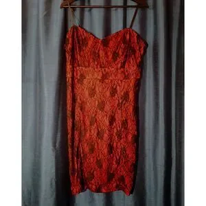 Super sexy red dress with black lace overlay. Thin spaghetti straps. silicone edging at the top of the dress, which will help dress stay in place. NWOT. This is an older Torrid tag, so I am thinking it was made in the early 2000's. This is giving goth vibes.