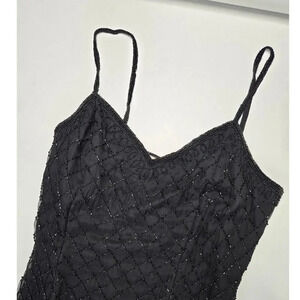 Sleeveless, zip closure, back slit, blazer has one hook closure, sheer, beaded, sweetheart neckline