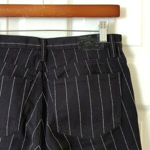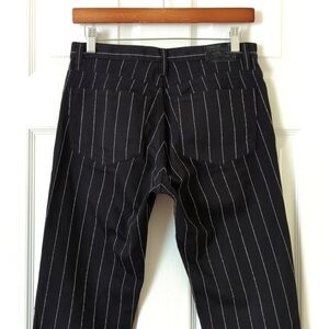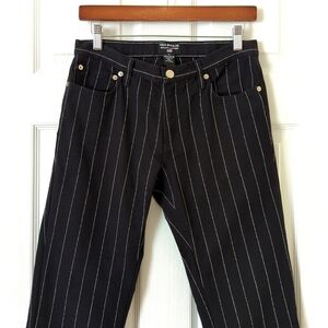 VTG and straight out of the 90s - These amazing jeans have a mid rise, relaxed fit and a straight leg. They feature a zipper and button closure, belt loops, and open pockets on the front and back. They have a black wash with white embroidered pinstripes. There is a small brand tab near the front right pocket and a brand patch on the back right hip. Very flattering, comfortable, and versatile! Retro, rare and high quality!