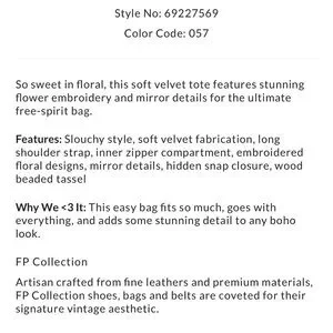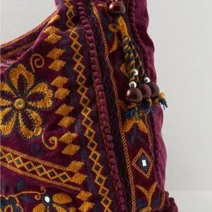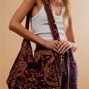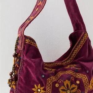 Free People Vic Velvet Hippie Boho Embroidered Shoulder Tote Bag
