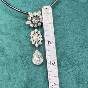 This striking statement necklace features a multi-tiered rhinestone pendant on a black leather cord. It has a vintage-inspired style, with a floral or sunburst-like cluster of clear rhinestones at the top, a marquise-shaped cluster in the middle, and a larger, faceted teardrop stone at the bottom that dangles for movement and sparkle. The black leather cord adds a modern contrast to the classic, glamorous feel of the rhinestone pendant.
