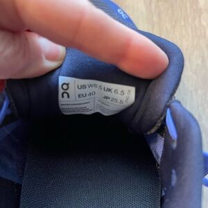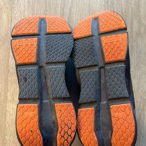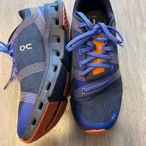 Dynamic navy and orange shoes by On Running. Ideal for sports and casual wear.