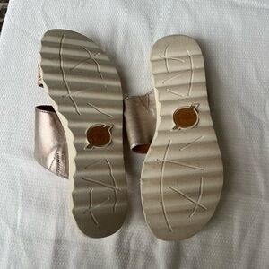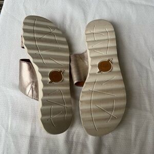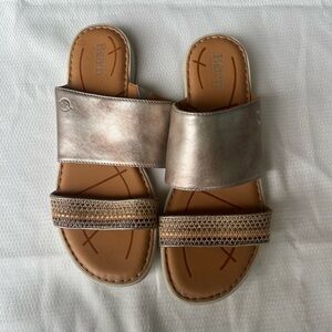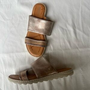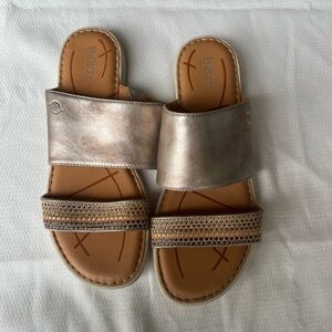 Elegant born sandals with a silver strap. Comfortable tan footbed. Perfect for casual outings.