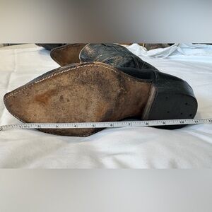 Classic black leather boots. Intricate stitching design. Perfect for a western look. The size markings have worn off the inside but they are approximately size 9 men’s.