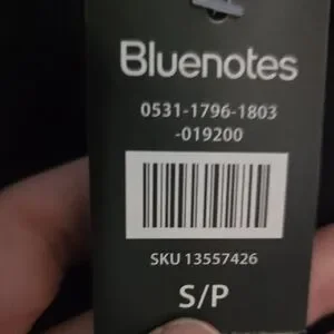 Bluenotes tag featuring a barcode and SKU details. Simple and sleek design.