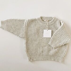 NWT 6/7 OAT & Co Pebble Chunky Knit Sweater & Sprinkle Knit Pant! Original owners. Never worn. Purchased from Oat & Co. Cozy cream knit sweater and Sprinkle Knit pants by OAT. These beautiful children’s items are a minimalistic dream. Less is more when it comes to clothing that goes well with everything and makes for the perfect capsule wear. From play to lounging. The chunkiest of all of our sweaters! This stunning chunky knit sweater is a beautiful capsule item for your child’s wardrobe. With quality and premium softness it’s a true wardrobe staple approved by mothers. Less is more when it comes to clothing that pairs well with everything and can be worn so many ways. This will become your go to wear again and again favorite for adventuring and relaxing. Ethically made.