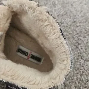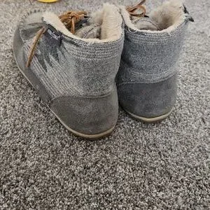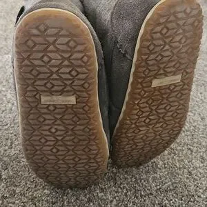 Soft slippers with plush cream interior. Gray exterior for a stylish look. they have a hard sole so you can wear them outside. super warm and cozy. great condition.