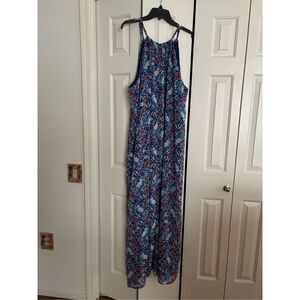 Ultra soft, fully lined long dress. Keyhole opening with button at the back neck. Flower and bird print. Pit to pit measure is 26 inches. Length is approx. 63 inches.