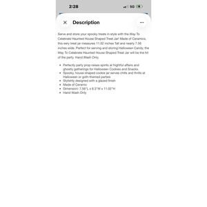 Serve and store your spooky treats in style with the Way To Celebrate Haunted House Shaped Treat Jar! Made of Ceramics, this eery treat jar measures 11.02 inches Tall and nearly 7.56 inches wide. Perfect for serving and storing Halloween Candy, the Way To Celebrate Haunted House Shaped Treat Jar will be the hit of the party. Hand Wash Only.