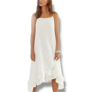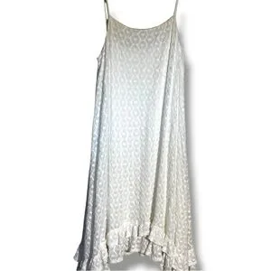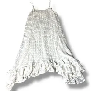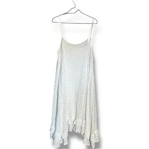 From Anthropologie, never worn, perfect condition; calf length and asymmetrical at the bottom with a flowing ruffle along hemline, Adjustable spaghetti straps, loose fitting and comfortable, breathable, perfect for layering or wearing to a more formal warm weather event