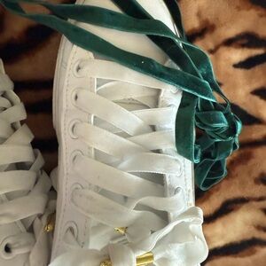 Elevate your look with PUMA's stylish platform sneakers. Sleek white design with gold accents. Perfect for casual wear. Gently worn , no box, 2 pairs of velvet laces , one green and one white pair , 8.5