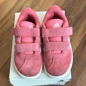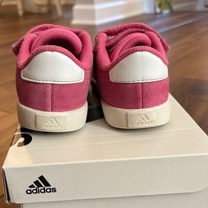 Adidas VL Court shoes, pink with classic white stripes. Easy velcro closure. Perfect for active play. They wash pretty well in the wash, see all photos for any markings.