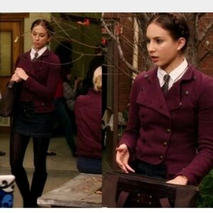Free People's "We The Free" Majorette Jacket in Burgundy Knit cropped front military jacket with filigree buttons. Double breasted, in good condition with minor wash wear - as seen on PRETTY LITTLE LIARS!